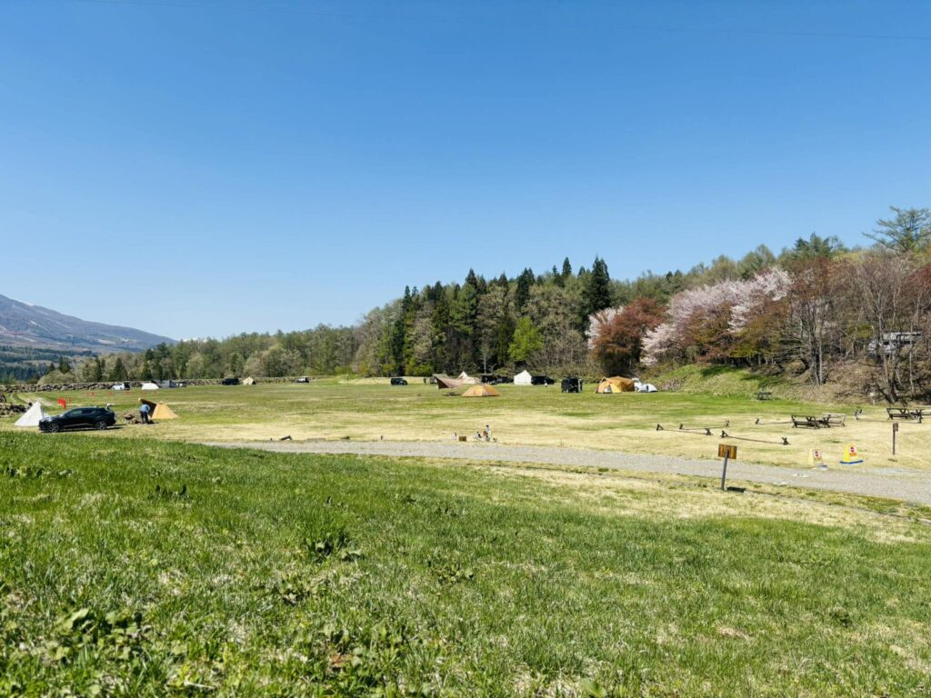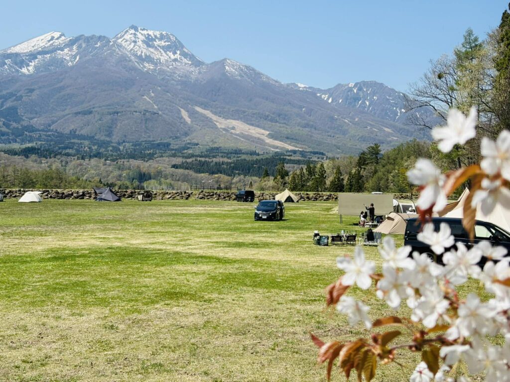 場内のフリーサイトからは、雪を残した妙高山の稜線がくっきりと。手前で揺れる桜の花とのコントラストは、この季節だけのごちそうのような風景です。芝生も少しずつ緑が濃くなってきて、テントを張ればそのまま絵になる開放感が広がっています。