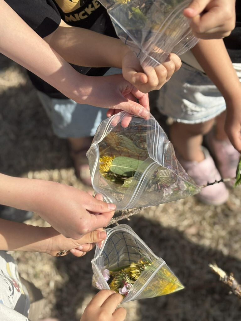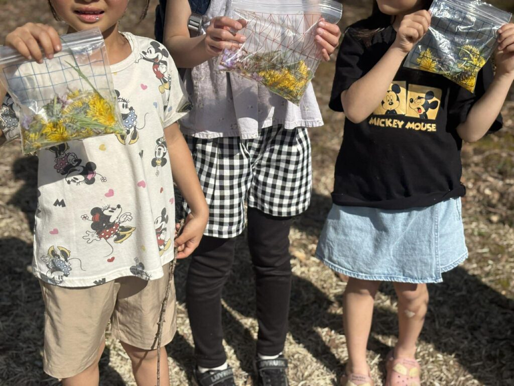 女の子チームは、タンポポやスミレ、桜の花びらをジッパーバッグに集めてうれしそう。「これはどんな匂い?」「こっちの黄色もきれい!」と、声を弾ませながらの花さがし。袋の中はまるで小さな春の標本のようで、見ているこちらまで笑顔になりました。