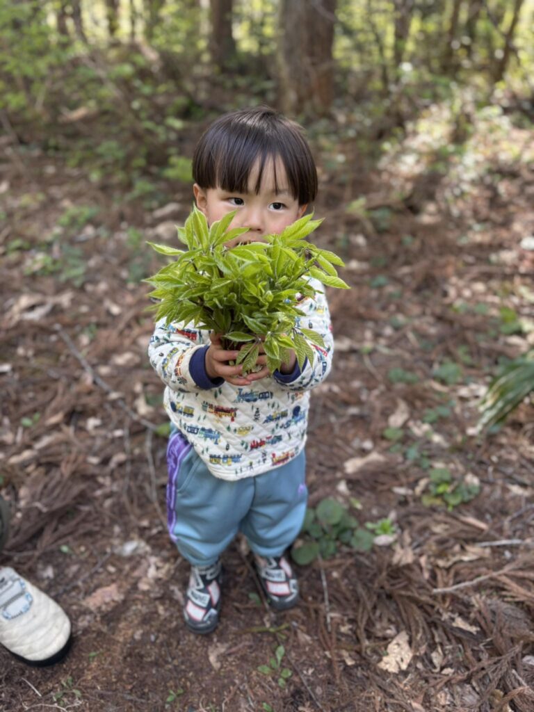 森の散策路では、小さな男の子が両手いっぱいにコシアブラを抱えて見せてくれました。やわらかな黄緑色の葉っぱは、まるで森のブーケのよう。コシアブラもまた春を代表する山菜で、爽やかな香りが特徴です。子どもたちが自分の手で見つけて摘み取る時間は、自然との距離がぐっと縮まるかけがえのない体験になります。